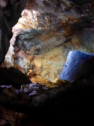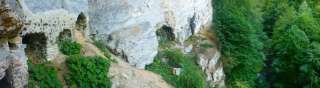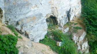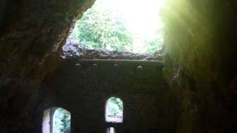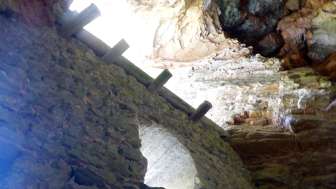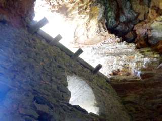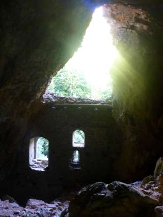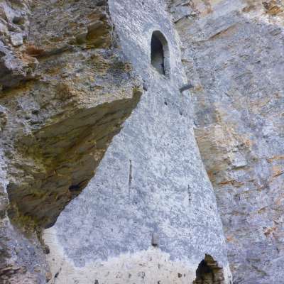 Castello in grotta. Mura robuste con feritoie e ingresso alto. Resti di travi di legno segnano la posizione dei pergolati e delle scale esterne che conducono all'ingresso alto. Ceppi di travi sulla sommità di una costruzione del tetto o di una sovrastruttura in legno. Interno della grotta in gran parte riempito da detriti di roccia. Una stretta breccia ai piedi della parete esterna permette di arrampicarsi all'interno della grotta.