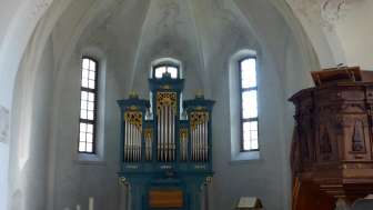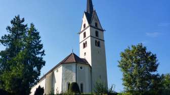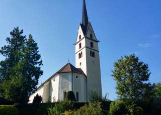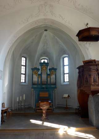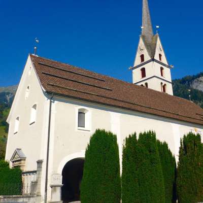 Si ritiene che la prima chiesa risalga al VII/VIII secolo. Lo snello campanile si appoggia alla maestosa navata tardogotica. La parete ovest del portico ad arco è ornata all'interno e all'esterno da epitaffi delle famiglie nobili Gugelberg, von Planta e von Salis. L'interno è caratterizzato da un semplice stile tardo barocco. Il suono delle campane comprende cinque campane dal 1961 e due dal 1788.
