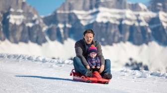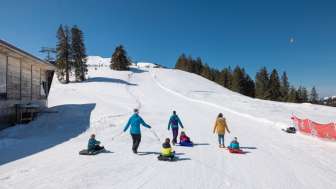 Divertimento in slittino per bambini Prodalp: situata accanto alla seggiovia, la discesa pianeggiante offre un divertimento sicuro per i bambini con un bob o una slitta da neve.