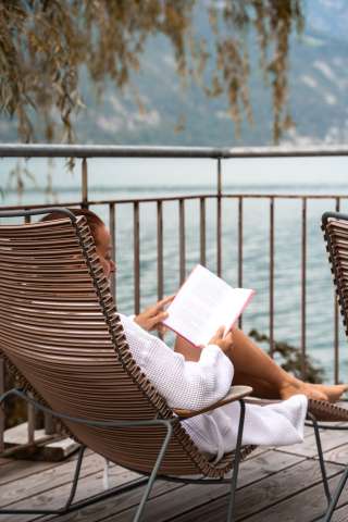 La piccola ma accogliente sauna all'aperto, con una spettacolare vista sul lago, è adatta per una, due persone (reclinate) o un massimo di sei (sedute). L'esperienza della sauna, della durata di due ore, è neutrale dal punto di vista climatico, poiché è alimentata con legno di Murg proveniente dalla foresta dell'hotel.