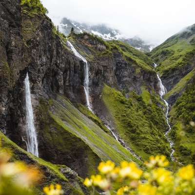 Ci si trova di fronte alle cascate di Piltschinabach, alte 81 metri (a sinistra), alle cascate di Sässbach (alte 86 metri, al centro) e alle cascate di Muttenbach (alte 45 metri, a destra). Poco più in alto, il torrente Lavtina confluisce nel torrente Piltschina e, poco più in basso, il torrente Guetental confluisce nel torrente Gufel. Ci si trova davanti a una centrale idrica a cinque bracci che è stata erosa in un'imponente arena di roccia. Non solo la vista è travolgente, ma anche i livelli di energia sono estremamente elevati e stimolanti.